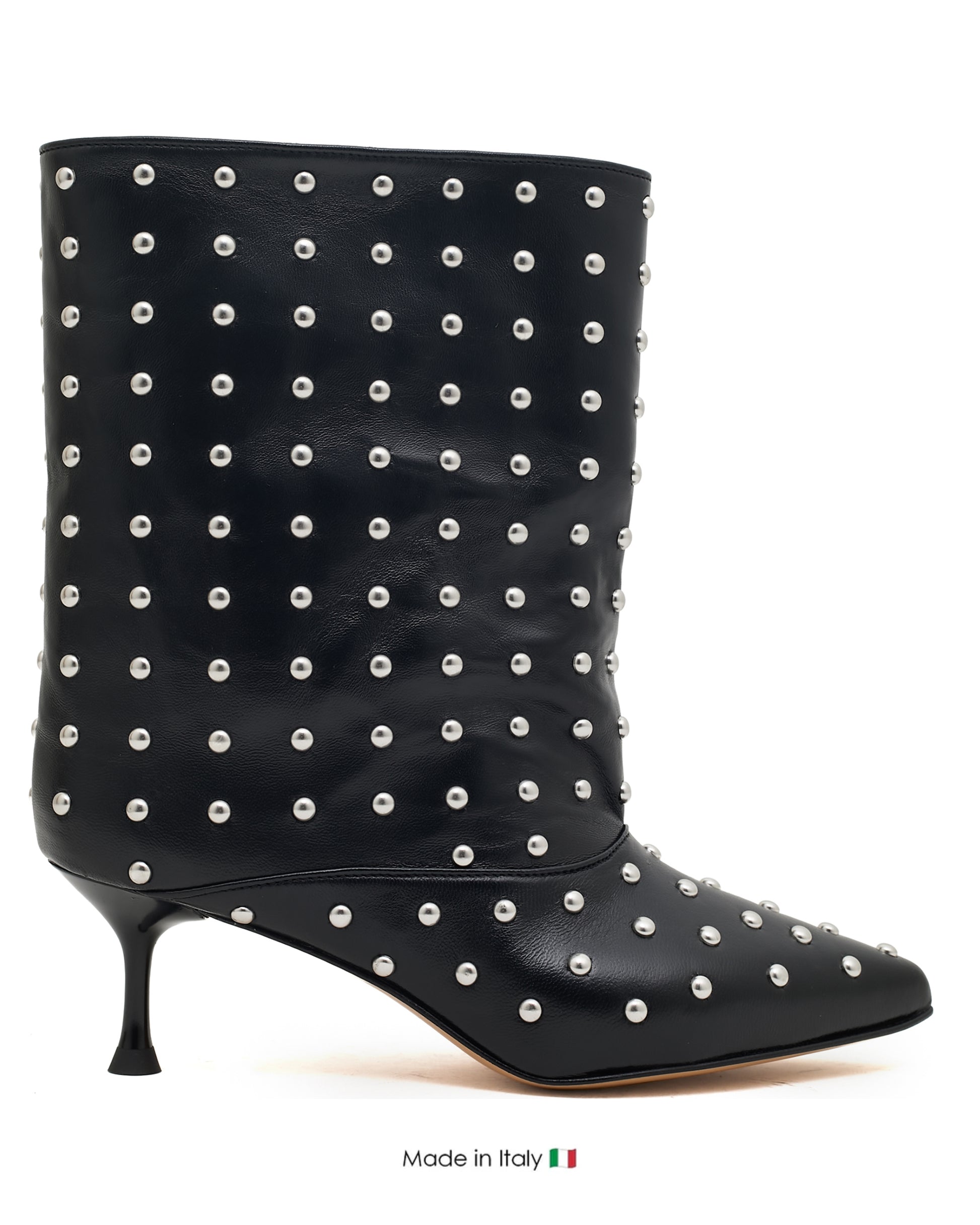 Masterful Embellishment: A dense, uniform constellation of Polished Silver-Tone Dome Studs blankets the entire boot, from the elongated, Precision Pointed Toe up the mid-calf shaft. The consistent application of hardware provides a visual texture that is both rebellious and richly opulent.