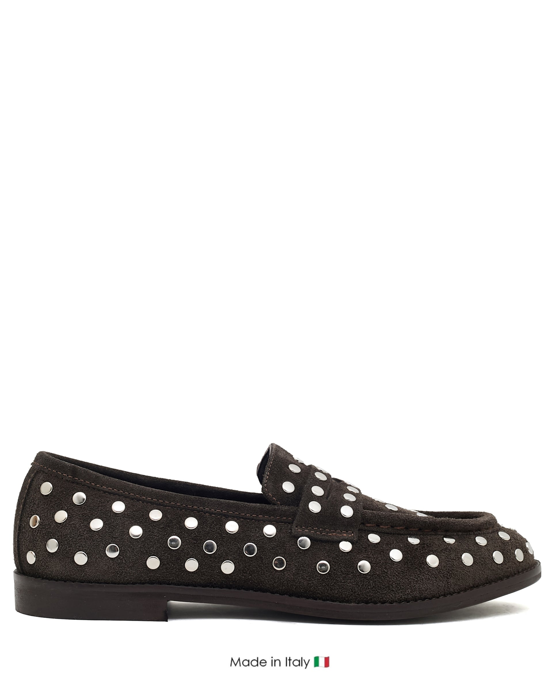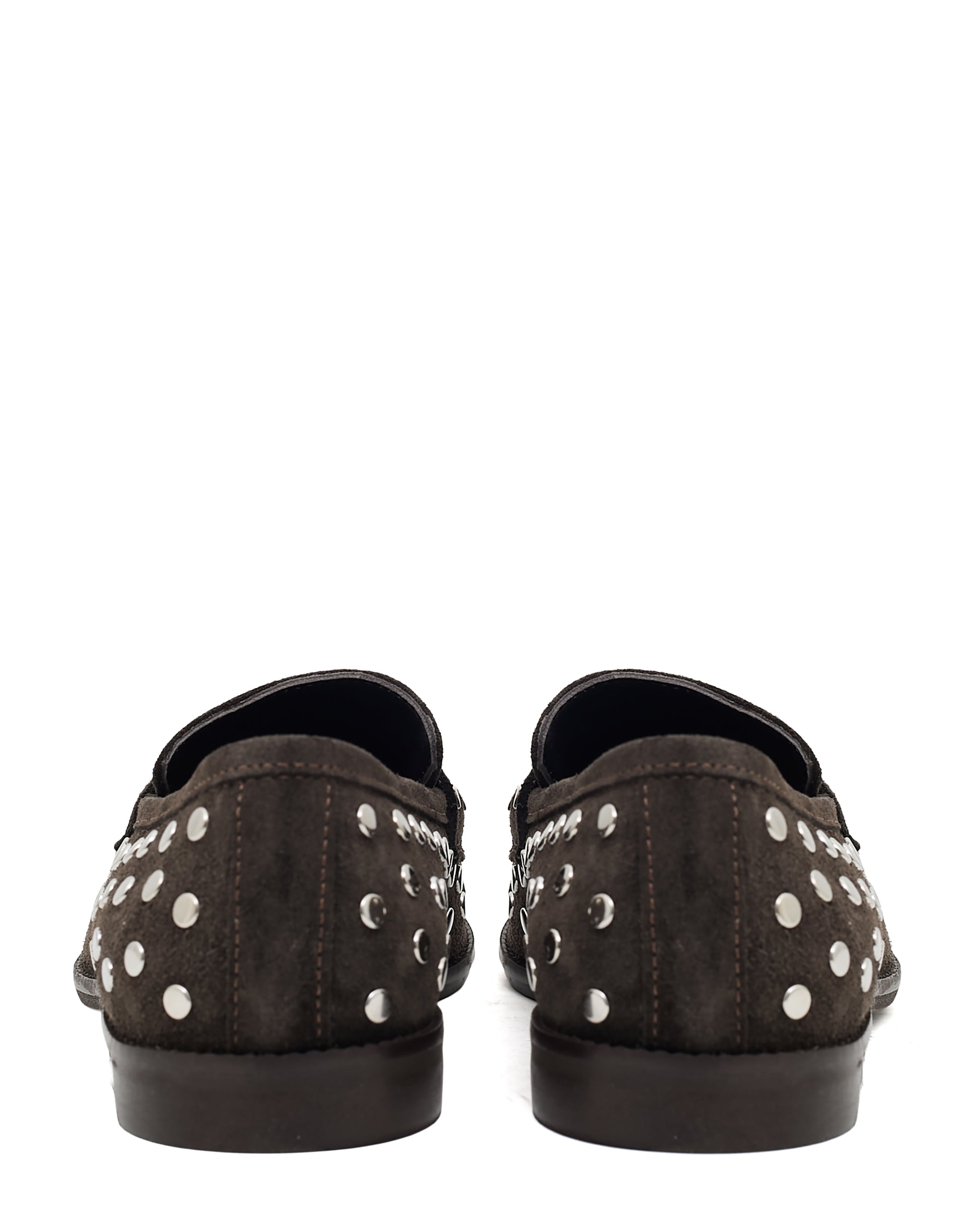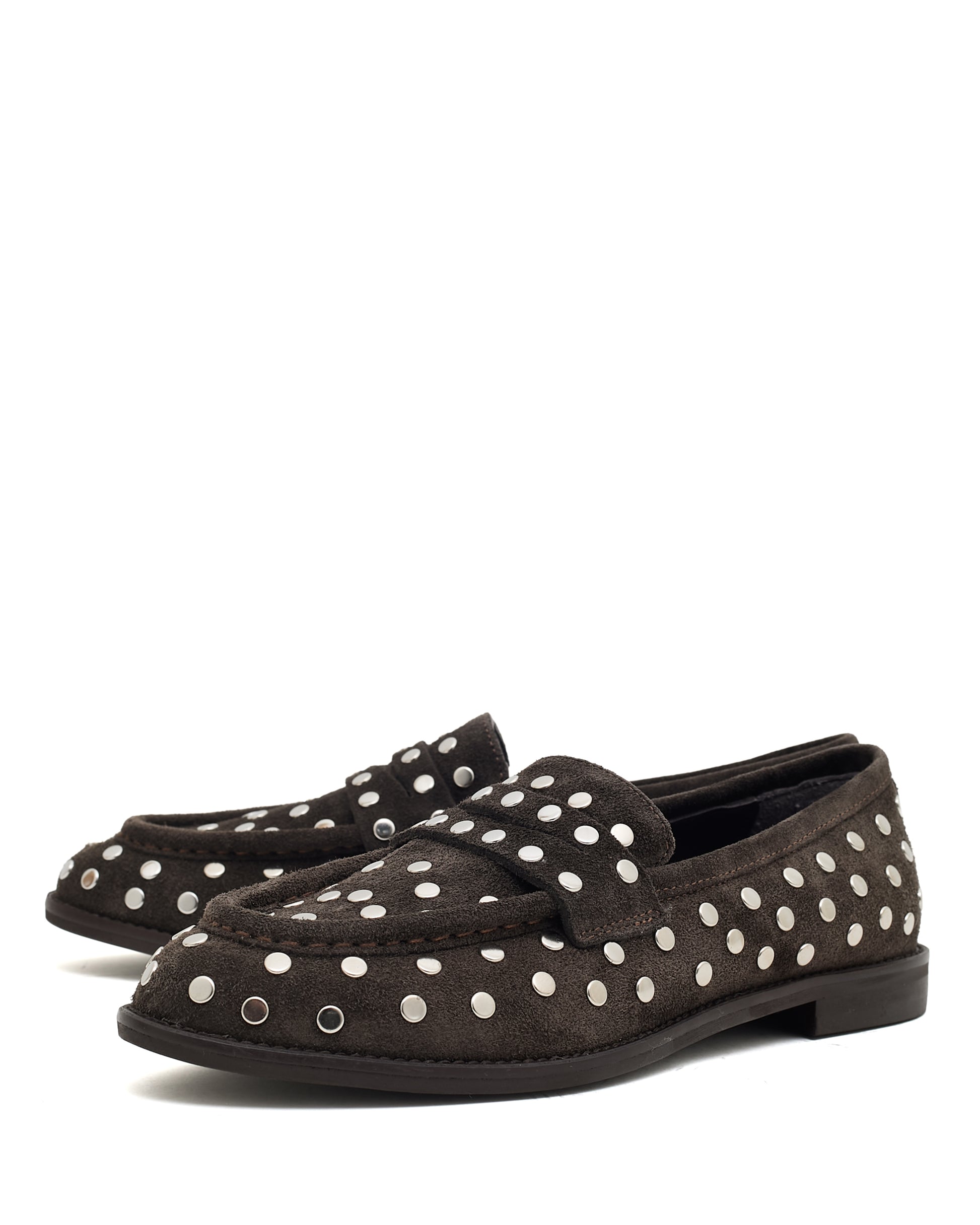 Distinctive Embellishment: Polished silver-tone dome studs are artfully placed across the toe, apron, saddle strap, and heel, providing a signature rock-chic edge to the traditional loafer silhouette.